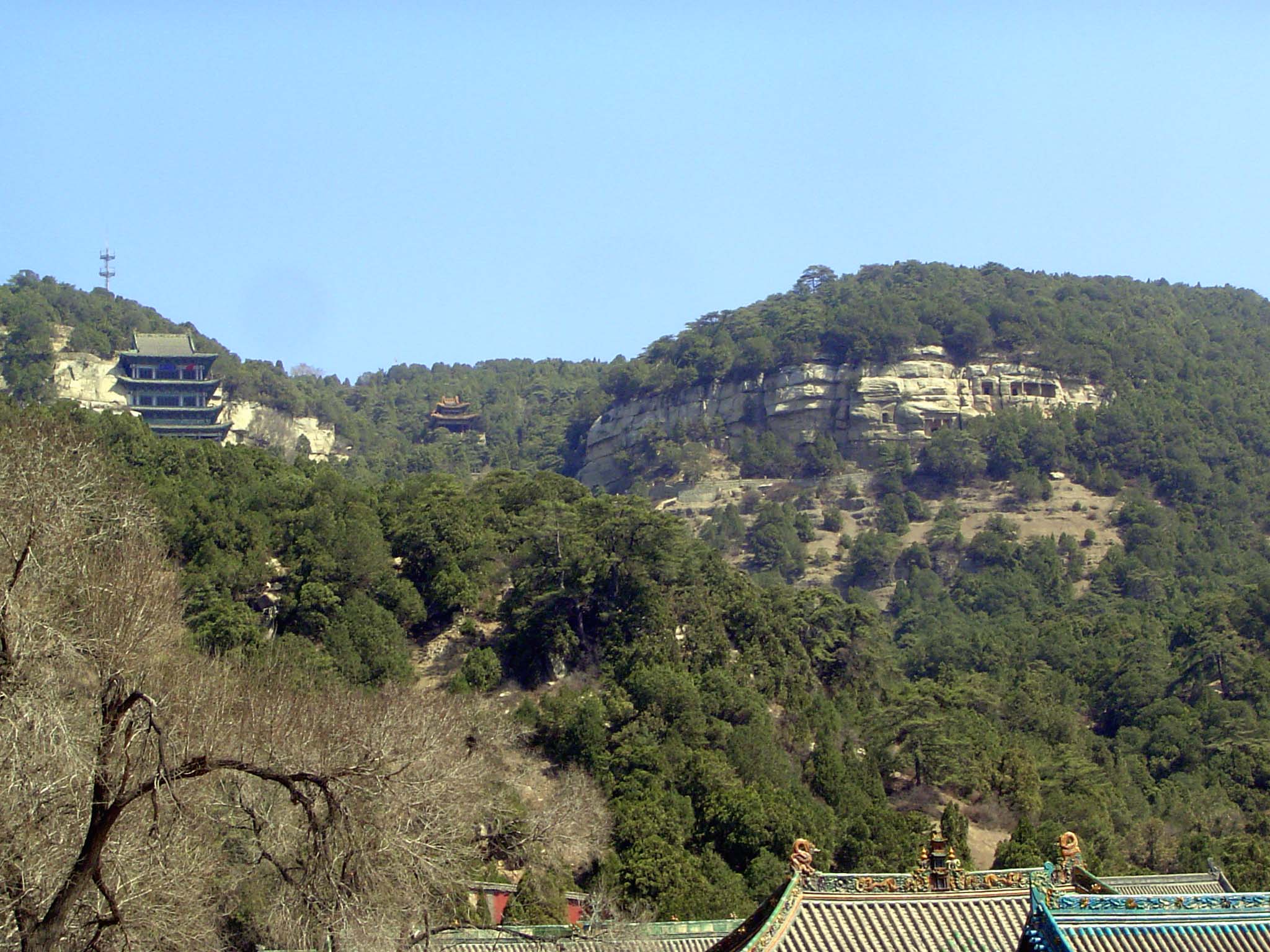 This is Tian Long Shan, Heavenly Dragon Mountain, and the road from Jinci comes over the top about where those power poles are on the skyline. Up there, you can't see what the fuss is, but continue on down to the bottom and you see Sheng Shou ("Imperial Longivity") Temple and some odd buildings on the cliff in the background.