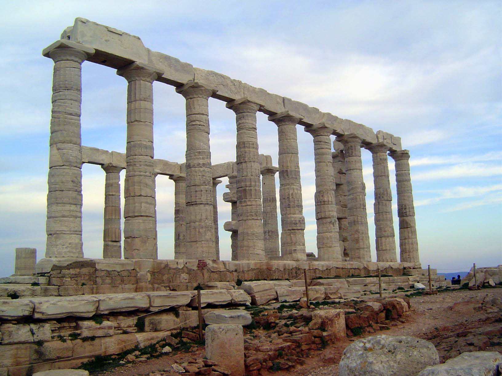 An hour's drive south of Athens—half that from the airport—Poseidon's Temple at Sounion rises 200 feet above the sea on a dramatic bluff.