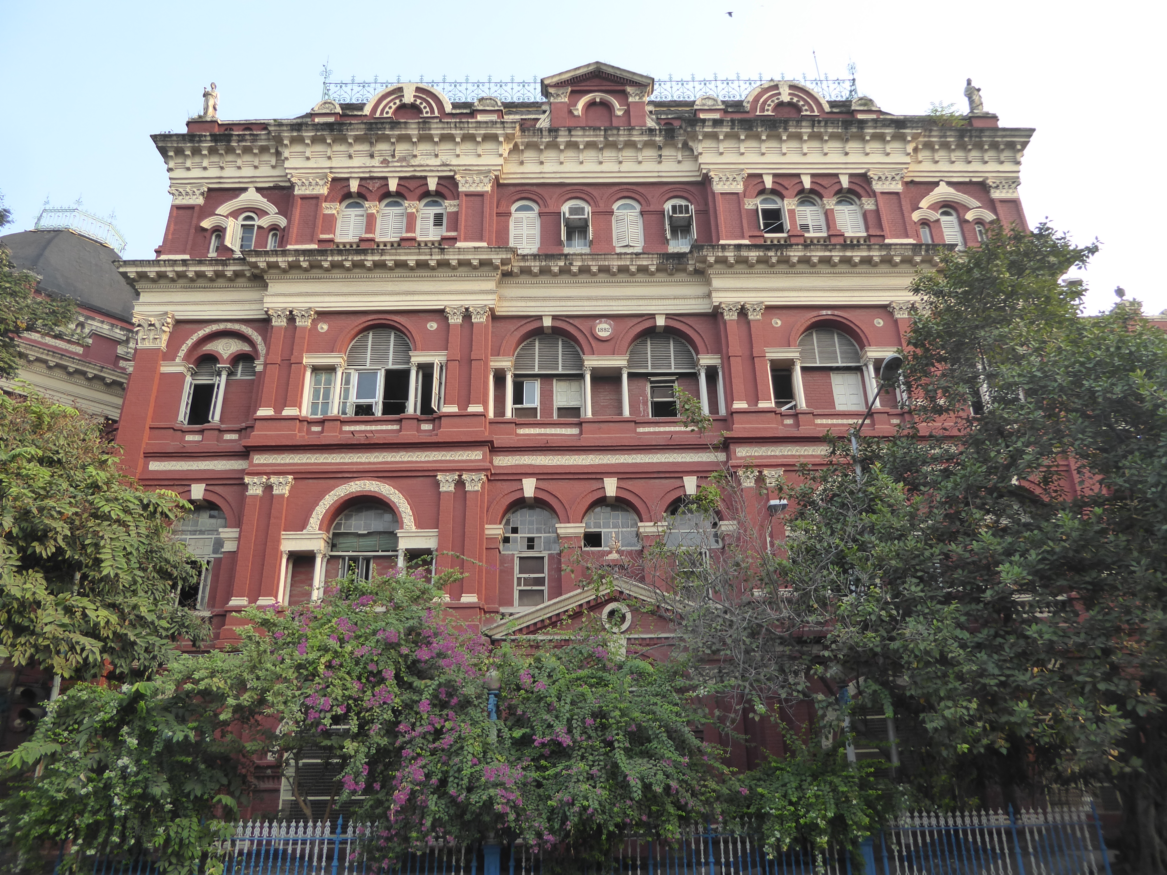 A matching building on the opposite of the street is obscured by screens but houses the Mahila Seva Samity, created in 1947 to provide relief to woman and children. It used to house the provincial headquarters of the Boy Scouts of Bengal, the St. John Ambulance Association, and the Bengal branch of the Indian Red Cross.