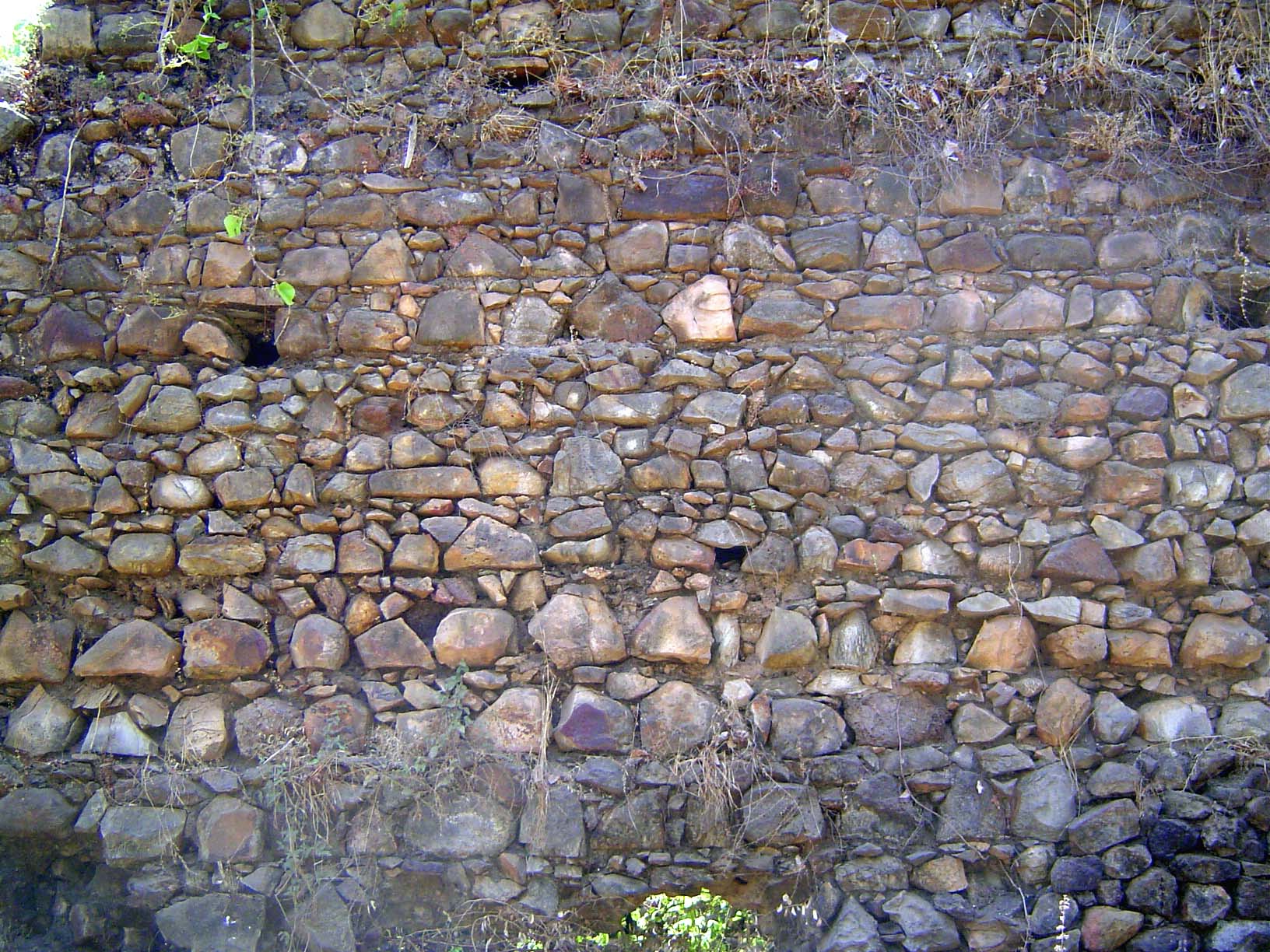 The top of the wall showing, in the distance, one of eleven bastions. A stone (now missing) dates the bastion: "During the reign of the most high and the most mighty King D. Joao of Portugal, the third of this name, and governing India the Viceroy D. Alonso de Noronha, son of the Marquis of Villa Real, Francisco de Sa being Captain of this Fort and City of Bassein, this bastion, named S. Sebastiao, was built, on the 22nd of February, of the year 1554."
