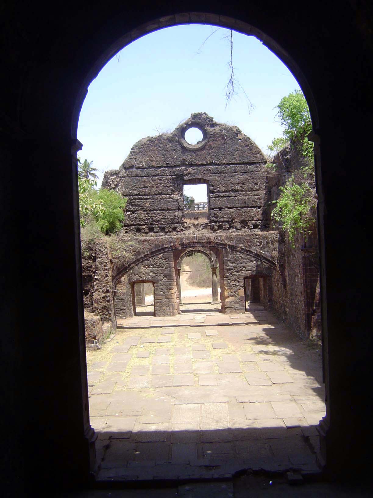 The overgrown cloister of the Franciscan church and monastery of St. Anthony. The church was built by Antonio do Porto, a missionary, at the expense of King Joao III, who gave it an endowment of 2,070 pardaos for a "seminary for the conversion of the heathen." The tower was later damaged by Maratha artillery. It was here that the last of the city's generals, Caetano de Souza Pereira, signed the articles of capitulation is 1739.