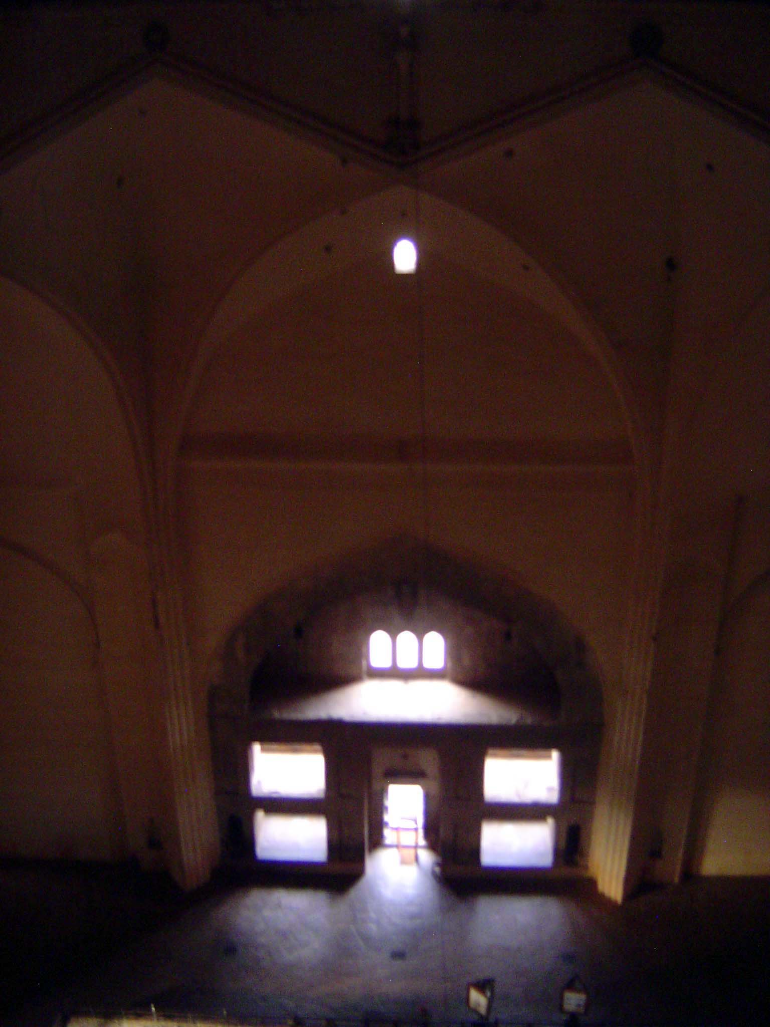 Critics marvel at the plain ceiling. How are the stone plates supported, they ask. The apparent answer is that the local mortar is so strong that it can support its own weight, as well as that of the slabs it binds. The same slabs form the floor of an upper room, reached through a concealed staircase now screened off.