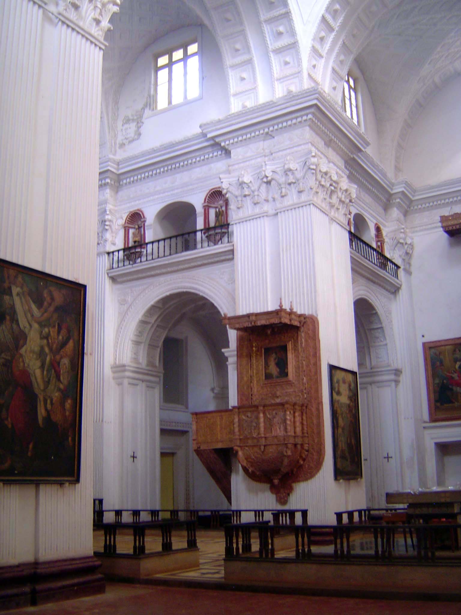 Often described as a smaller version of St. Peters, the church was modelled more directly on the church of the Madonna della Ghiara, which is in Reggio Emilia and which was based on Bramante's unexecuted design for St. Peters. The elaborately carved pulpit is characteristic of Goan churches.