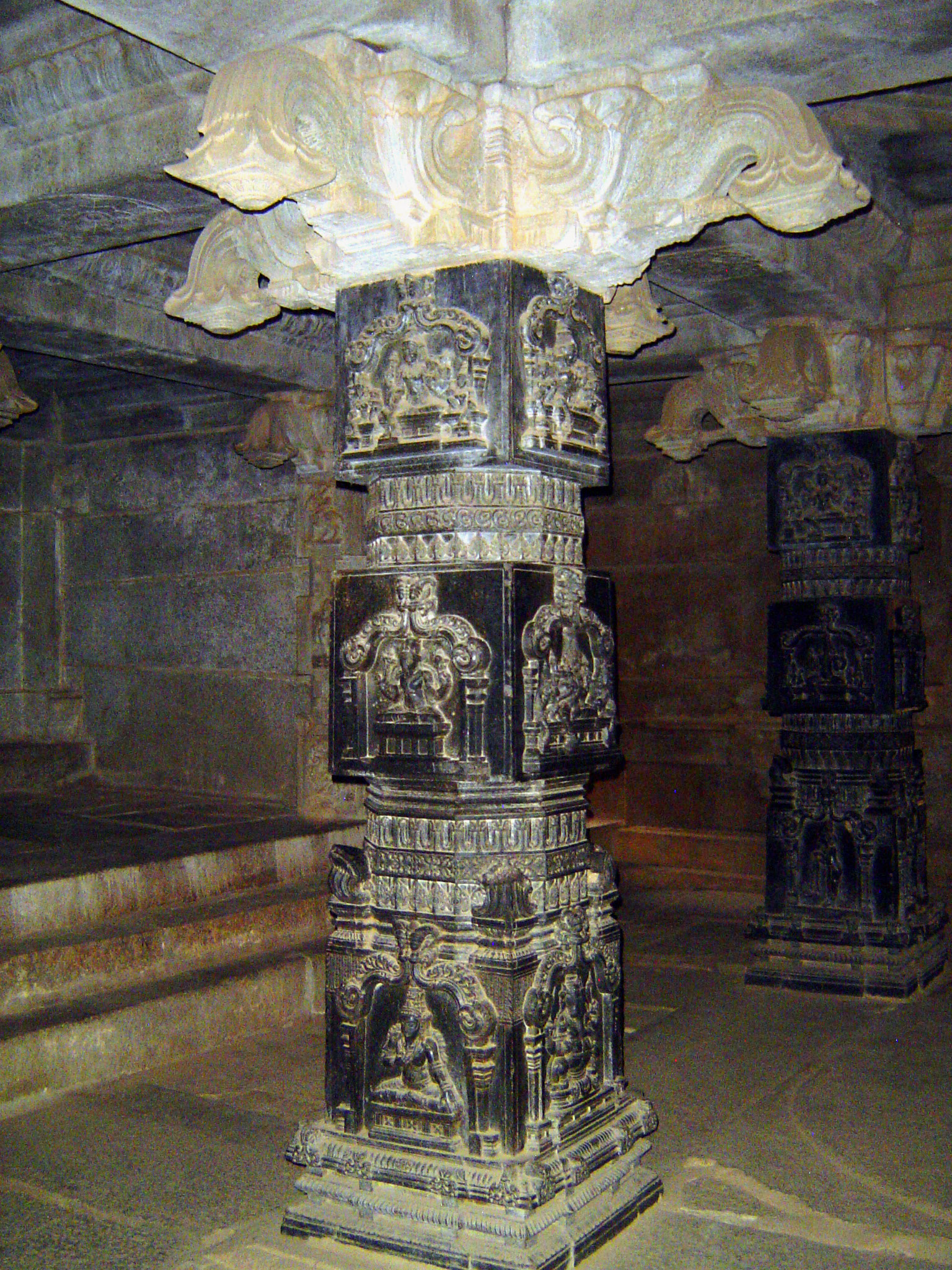 The pillars are decorated with images of the various aspects of Vishnu.