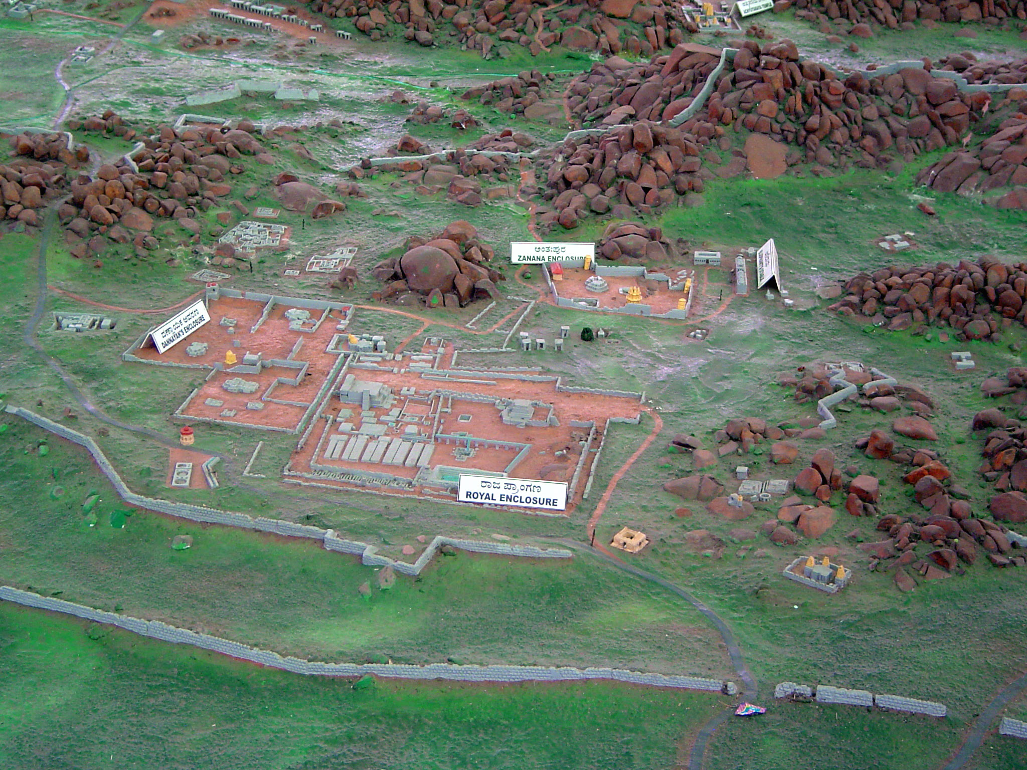 We can enter at the lower right, where a road cuts through a gap in the city wall. The first buildling on the right is a Shiva temple, noteworthy for an splendid though underrated gopura. The second building, closer to the road, is the so-called Queen's Bath. The road then winds around to the far side of the Royal Enclosure with a Great Bath hidden behind the sign and, just beyond the bath the smaller but much more remarkable Stepped Tank. The flat-topped platform slightly behind and to the right of the stepped tank is a great ceremonial platform, once roofed. There is a long alley between the royal enclosure and another enclosure to the left. At the far end of that alley is the Hazara Rama or Ramachandra Temple, the private temple of the empire's ruling family. The other large enclosure contains the ruins of presumed palaces. Closer to the hills is the Zenana Enclosure, containing the Lotus Mahal, elephant stables, and a watchtower visible here as a yellow tower at the lower right corner of the enclosure. At the upper right is the Krishna Temple's bazaar.