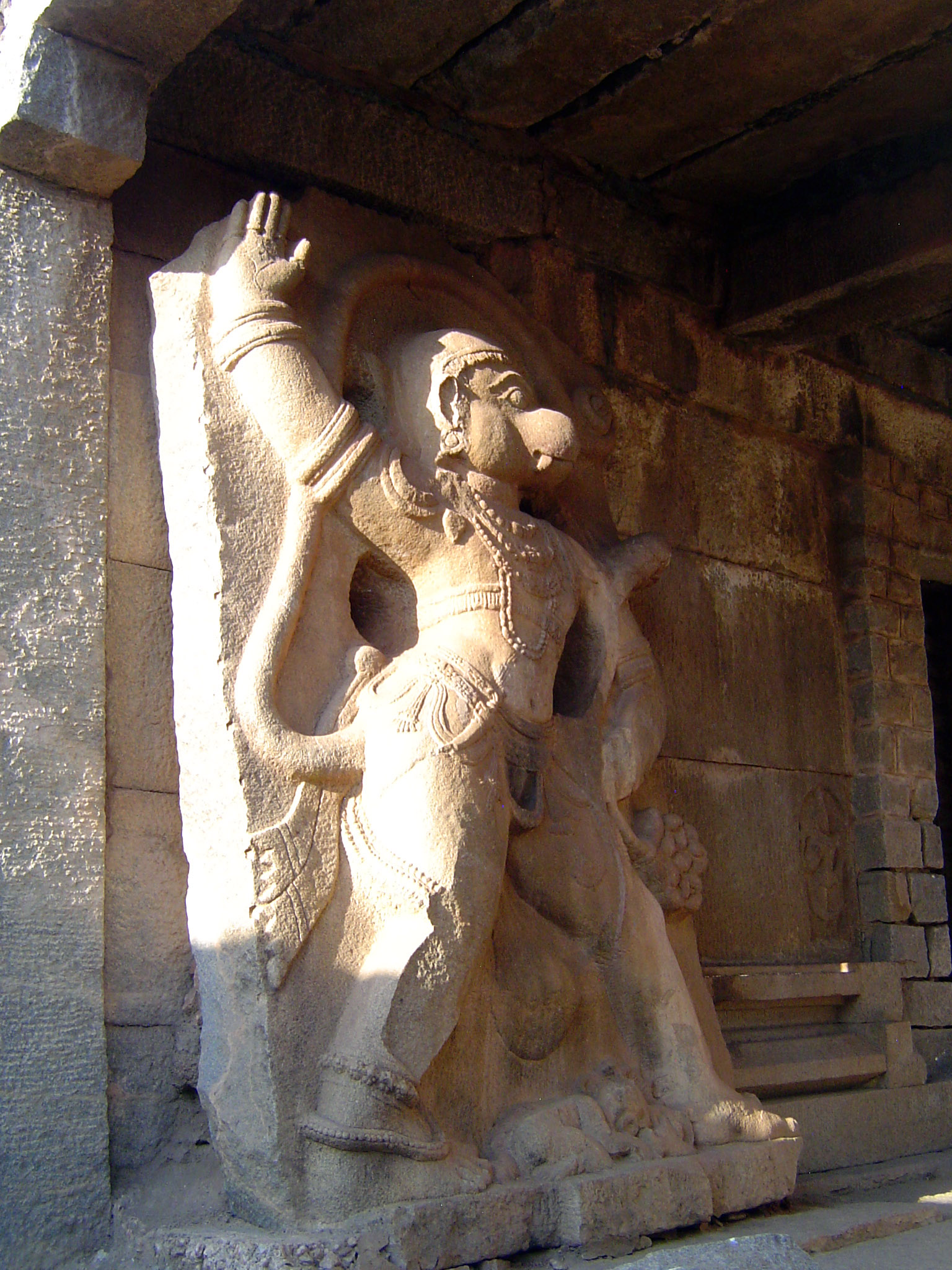 Here, in the Madhava Temple, is a monolithic statue of Hanuman, Rama's helper in the Ramayana. According to tradition, Rama met Hanuman nearby at Kishkindha, the home of the monkey chiefs. Somehow the statue wound up carelessly propped against the temple wall, and there it sits.