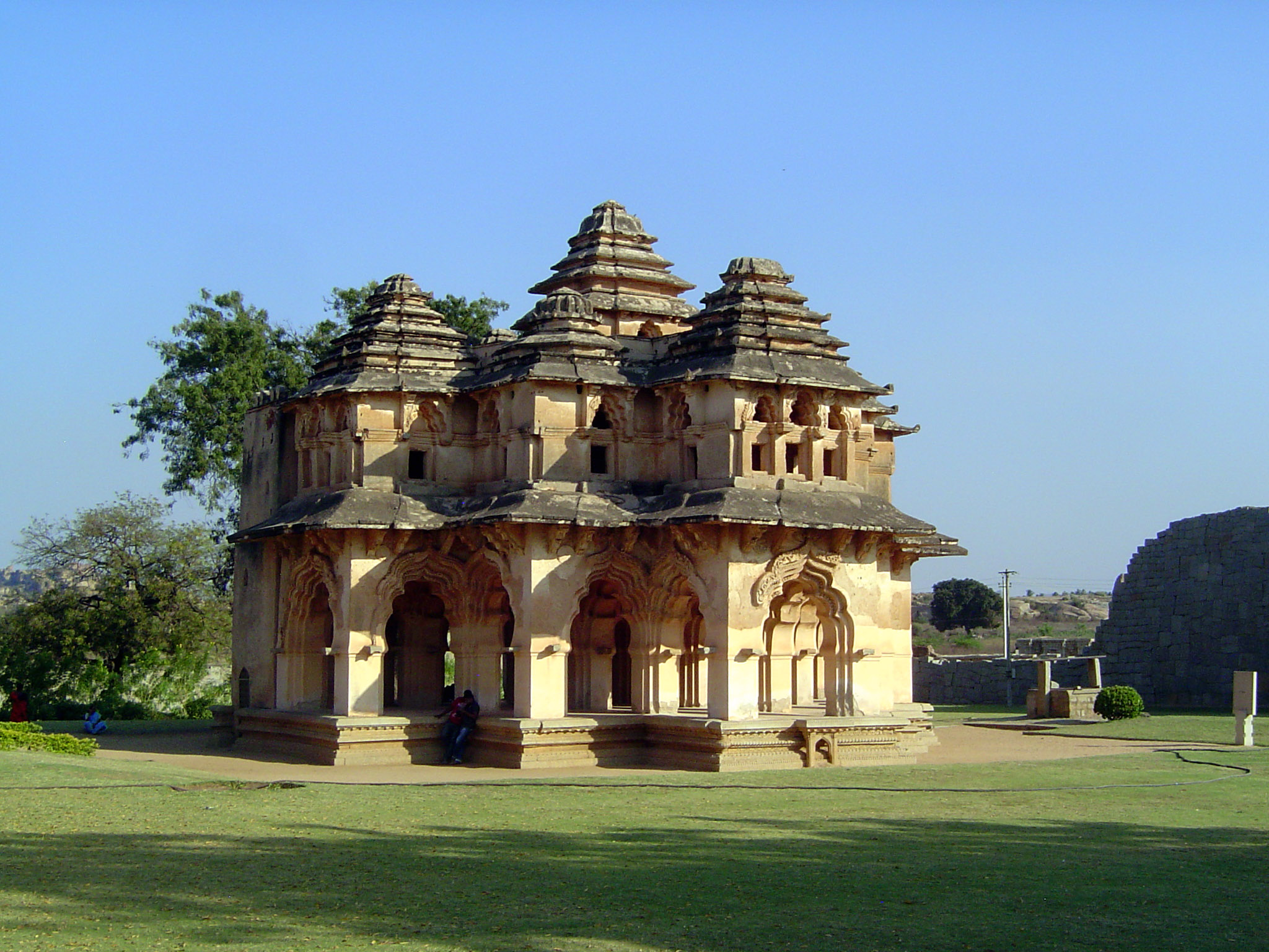 The best-known building within is the Lotus Mahal, with nine pyramid-shaped roofs. Despite its name, bestowed about 1910 by the Archaeological Survey of India, it was presumably a meeting hall for the king and his ministers; until 1910 it was in fact called the Council Chamber.