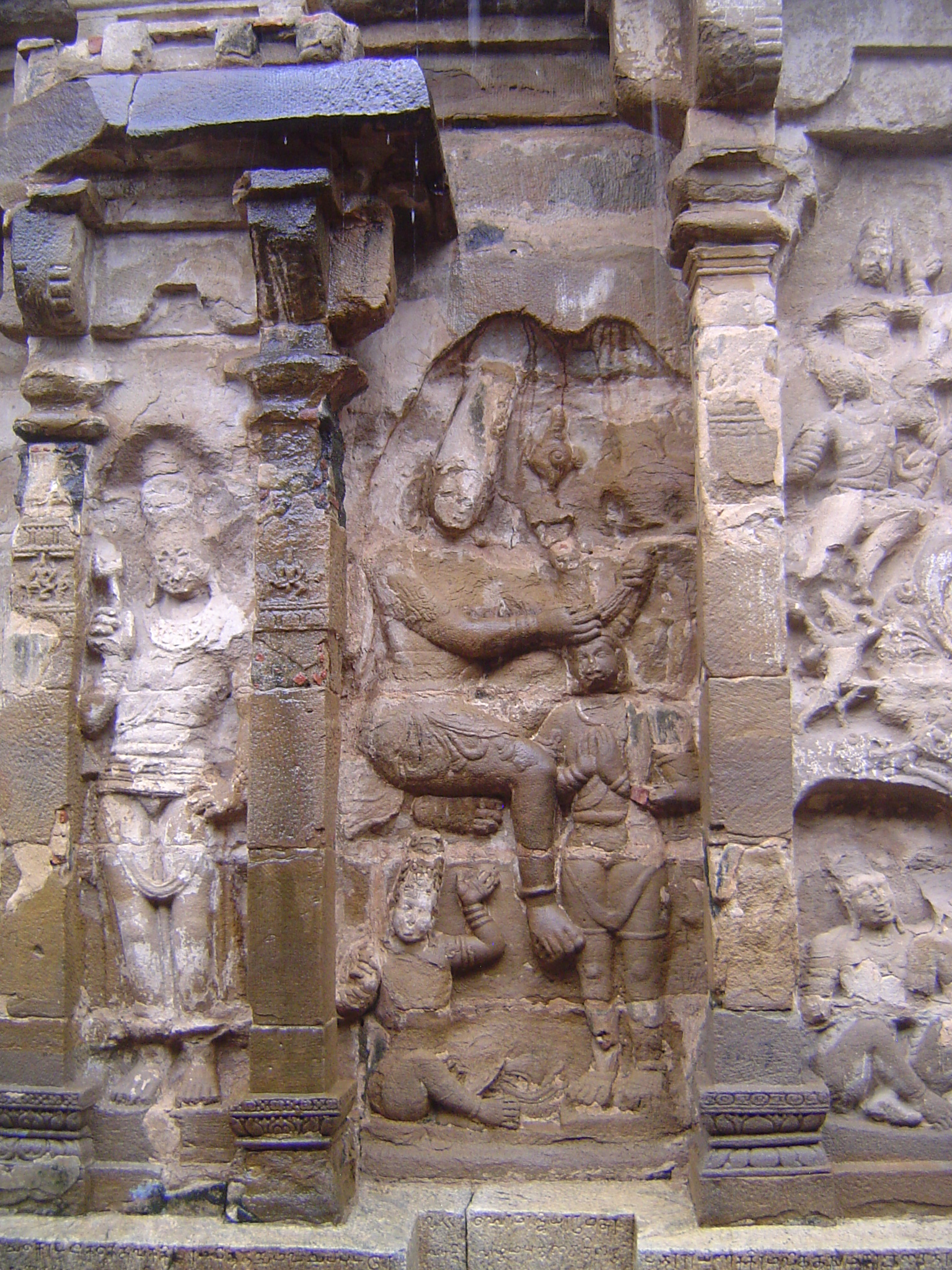 The walls of the vimana are elaborately sculpted with two dozen figures, two at each corner and four on the sides between. The figures are in poor shape and haven't been helped by repairs done in plaster. There's also the small matter of what the images mean and how they cohere as a set, which presumably they were once understood to be, at least by knowledgable visitors.