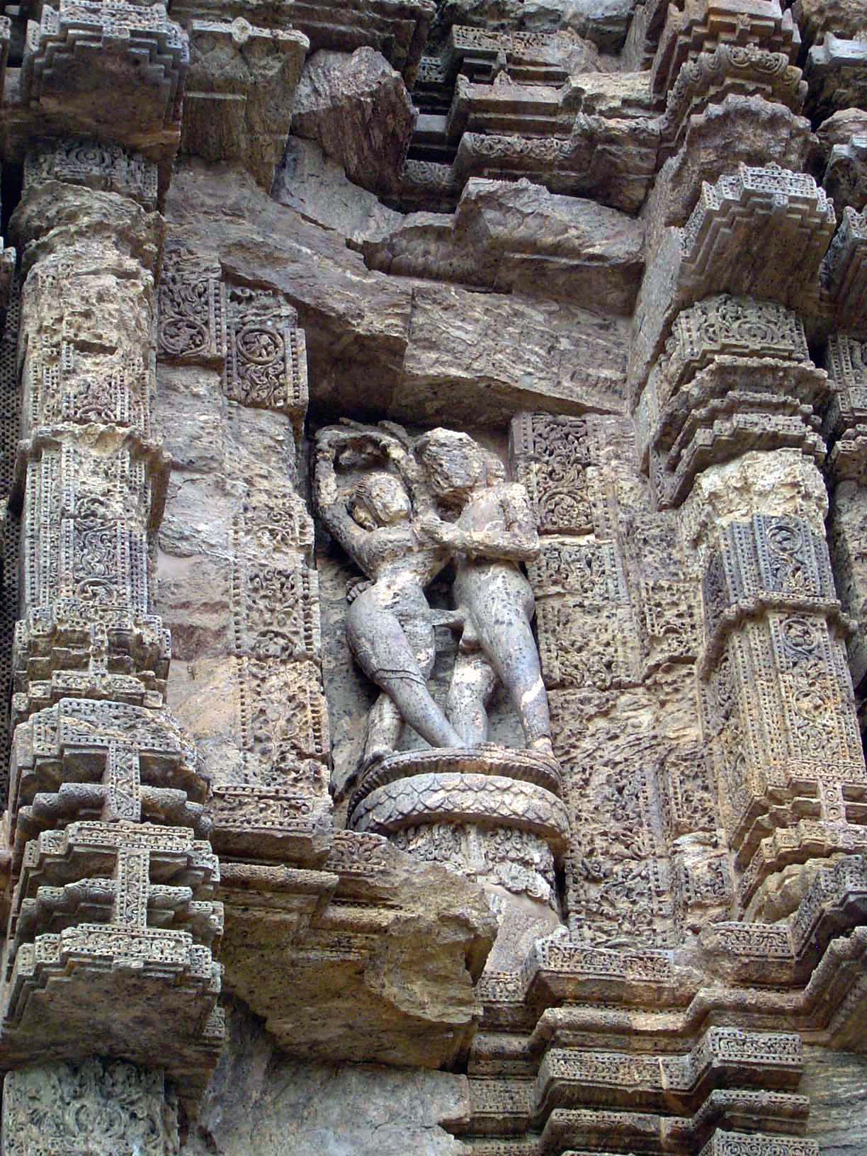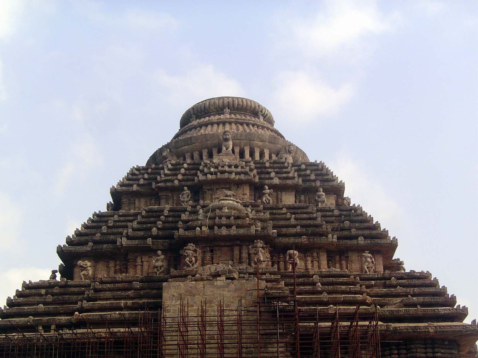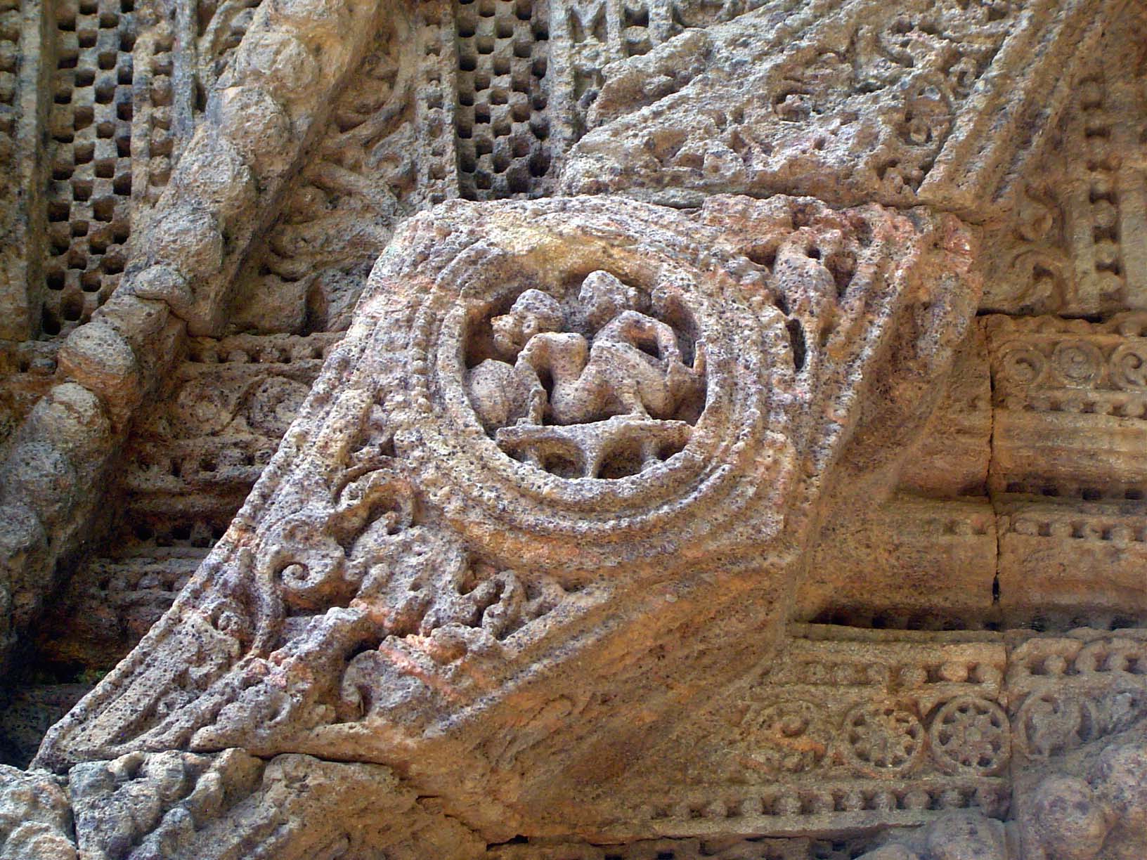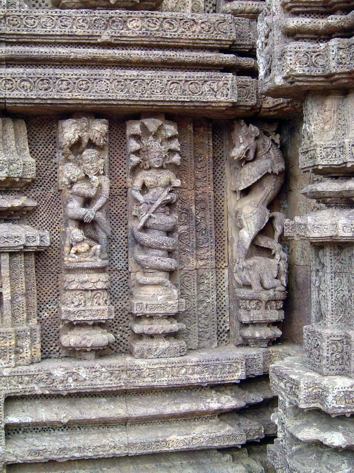 The Sun Temple at Konarak is a superlative in a country of superlatives. Built, it appears, in the 13th century, it was abandoned after the Muslim invasion of Orissa early in the 16th. Composed largely of khondalite, a gneiss that weathers easily, without maintenance the temple began to fall apart. Approximately half of it was gone when European visitors arrived for the first time. Shortly after 1900, serious conservation efforts were made to stabilize what remained. That lesser half, amounting to no more than the entrance porch or jagamohana of the vanished sanctuary or rekha is one of India's most spectacular sights.