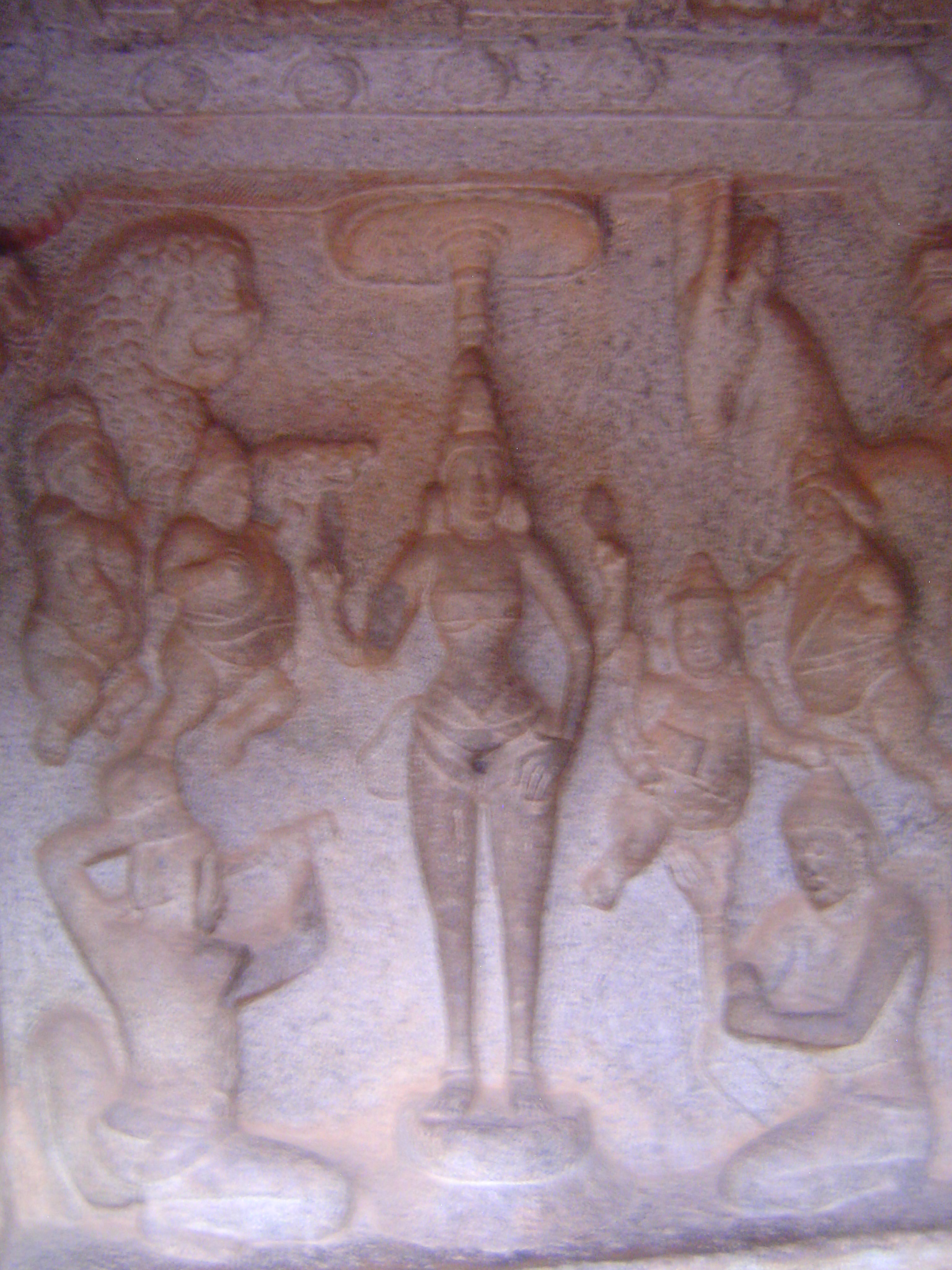 The facing panel shows Mahishasuramardina herself, alias Durga, astride her lion and about to kill the Buffalo Demon, Mahishasura. He had grown so powerful that he was acknowledged as the king of heaven. (The umbrella overhead signifies his royal power.) Neither Brahma, Vishnu, nor Shiva could get rid of him, but their combined anger created a new goddess, Durga, to whom they gave their weapons. With them, she did the job. For a long time, this vivid panel has been considered one of India's most outstanding sculptural achievements. Jouveau-Dubreuil calls it "assuredly one of the best works in India." Note: Gabriel Jouveau-Dubreuil was a professor at the Pondicherry college. Of Mamallapuram in general he wrote that "the traveller who formerly took the road from Pondicherry to Madras, found on his way very strange monuments: these were not built of stones placed above one another, but were simply rocks that the sculptor's chisel had worked on, either to give them the external form of a building, or to excavate in them subterranean chambers" (Pallava Antiquities, 1916, p. 7).