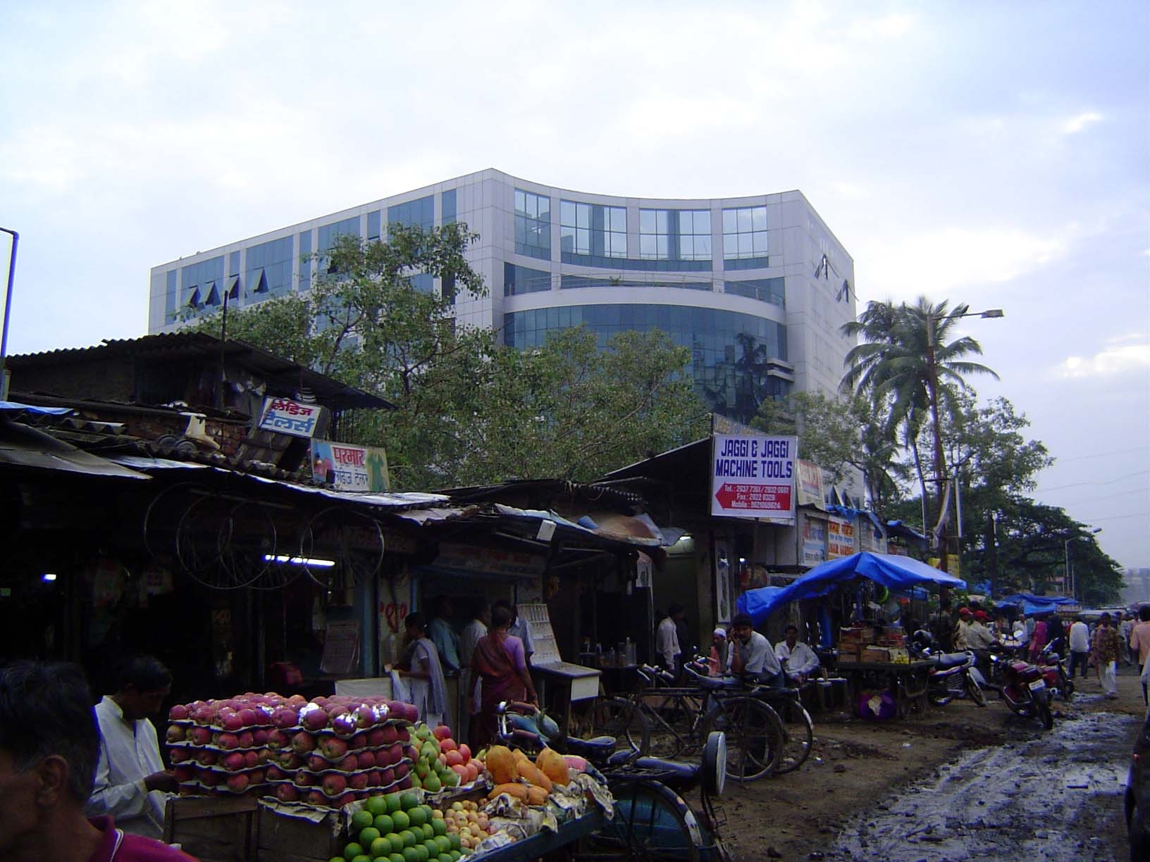 Roadside vendors and, in the background, a new building housing the Axis Bank, Electrolux India, and Skoda.