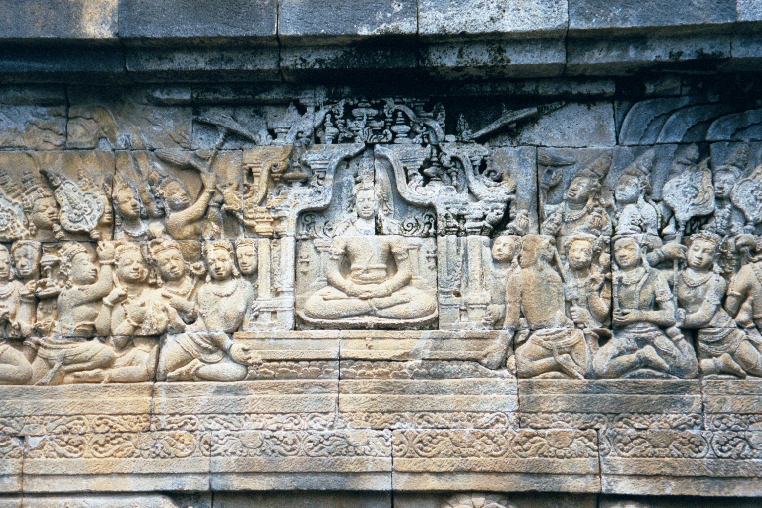 The upper row on the main wall of the first terrace recounts in 120 panels the life of the Buddha. Specifically, it illustrates the text known as the Lalitavistara, or "Unfolding of the Play." Some 45 images are shown here from this sequence, which ends 40 years before the Buddha's death and at the peak moment when he expounds the Law for the first time. Until 1901, nobody knew what the panels were about: that was the year a Dutch scholar decoded them by linking them to the Lalitavistara. In retrospect, it doesn't seem as though it should have been so difficult, but see for yourself.