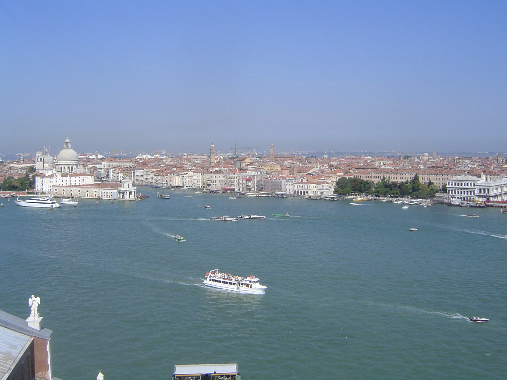 The Lido is across the lagoon; beyond lies the Adriatic. The piles indicate safe channels. In the foreground, of course, is a bit of the Isola San Giorgio Maggiore. Before construction of the church, gardens and salt-evaporation ponds shared the island with a smaller church that dated back to 790.