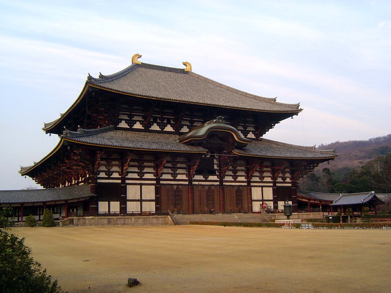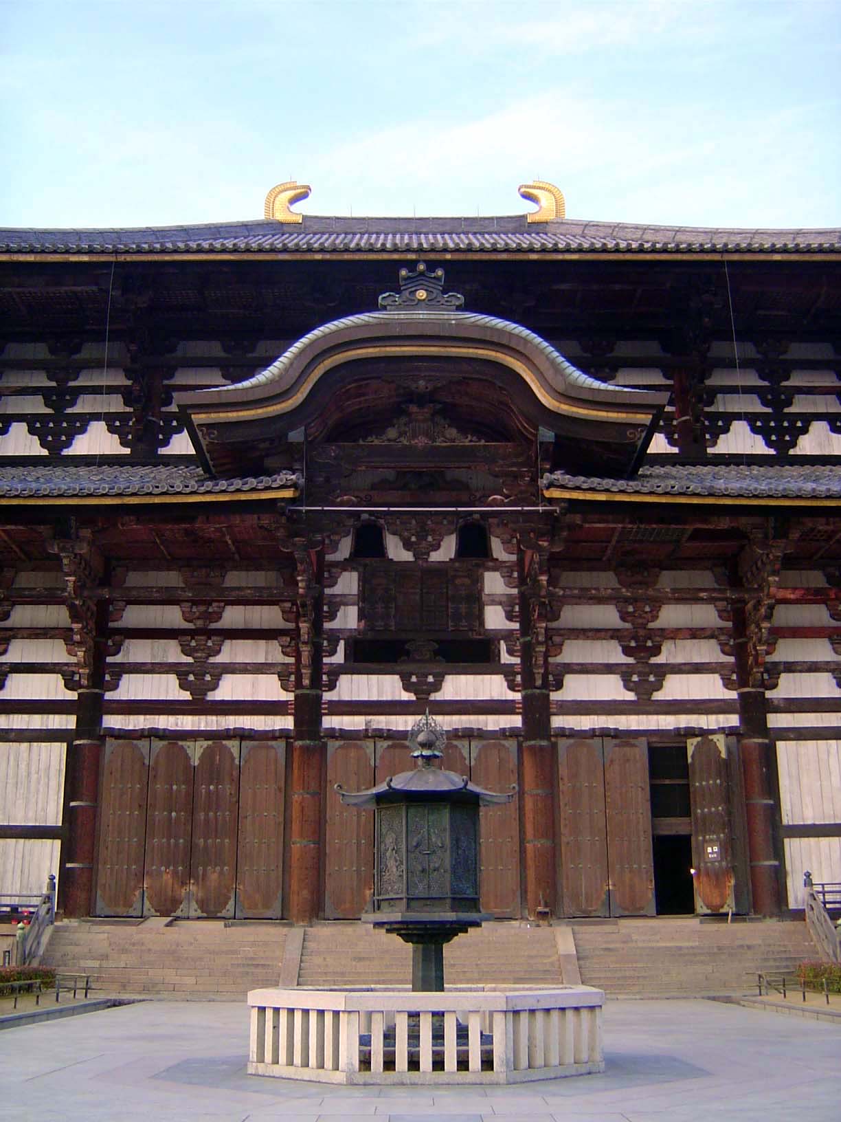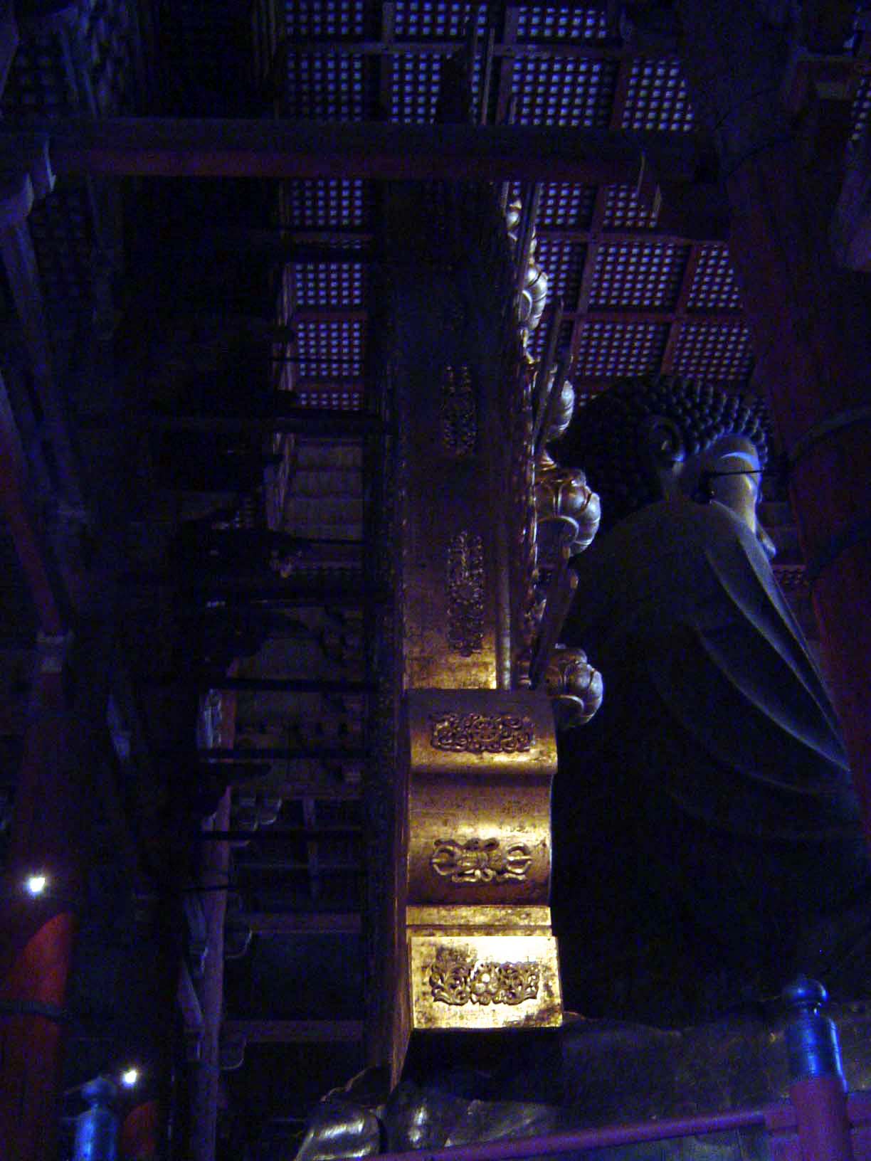 Still, it's smaller than it used to be, by four bays or ken. The earlier, bigger versions were dedicated in 722 and 1180; this one, in 1708. The structure, now as in the earlier versions, is based on a massive wooden latticework of pillars (hashira) and horizontal connectors of two types: beams, which join columns along the depth of the building (hari), and purlins, which join pillars across the bays or face of the building (keta). Struts and rafters are laid on the beams and purlins to support the roof, tile in this case. The golden rooftop "horns" are also tile; they're more properly called acroteria (Japanese = shibi) and are a highly stylized fishtail. (For much more on this subject, see Kakichi Suzuki's Early Buddhist Architecture in Japan, 1980, or Mary Parent's The Roof in Japanese Buddhist Architecture, 1983.)
