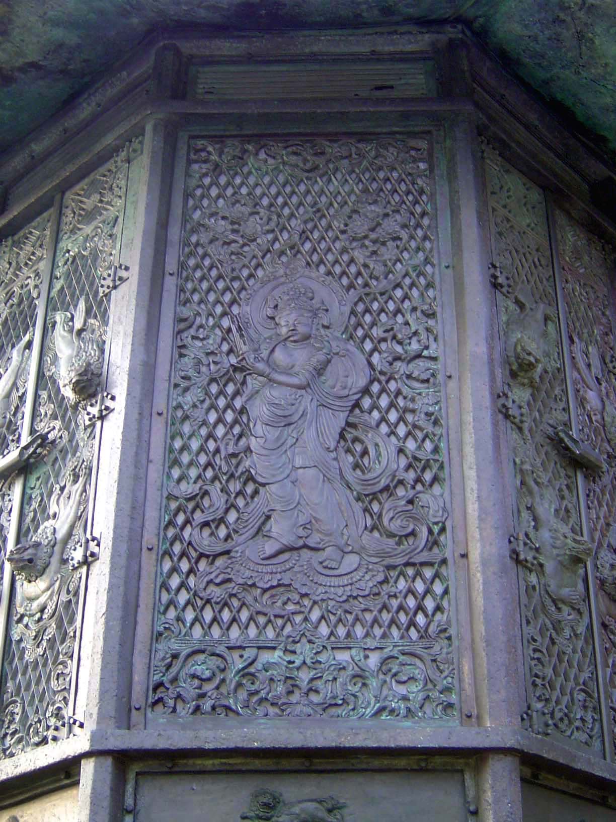 A week after achieving enlightenment, the Buddha is said to have preached a sermon that encapsulates the Kegon doctrine; that sermon is literally called the Kegon, meaning a bunch of flowers. Hence these bronze ones, which are perhaps more evocative than the massive statue behind them.