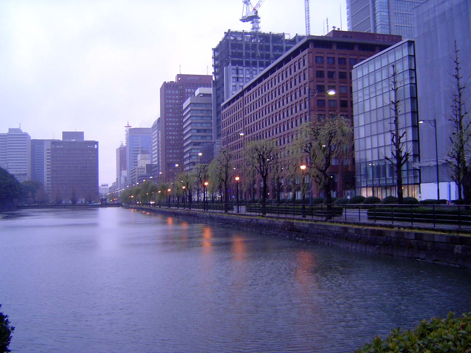 Off to the left, the Imperial Palace is hidden behind its moat and forest. On the right, Marunouchi, literally "within the walls," a name that alludes to a now-vanished palace wall that once enclosed this area. This is the same area that later became Mitsubishi Meadows—one of the world's great stories of real-estate speculation. Two blocks to the right is Tokyo Station.