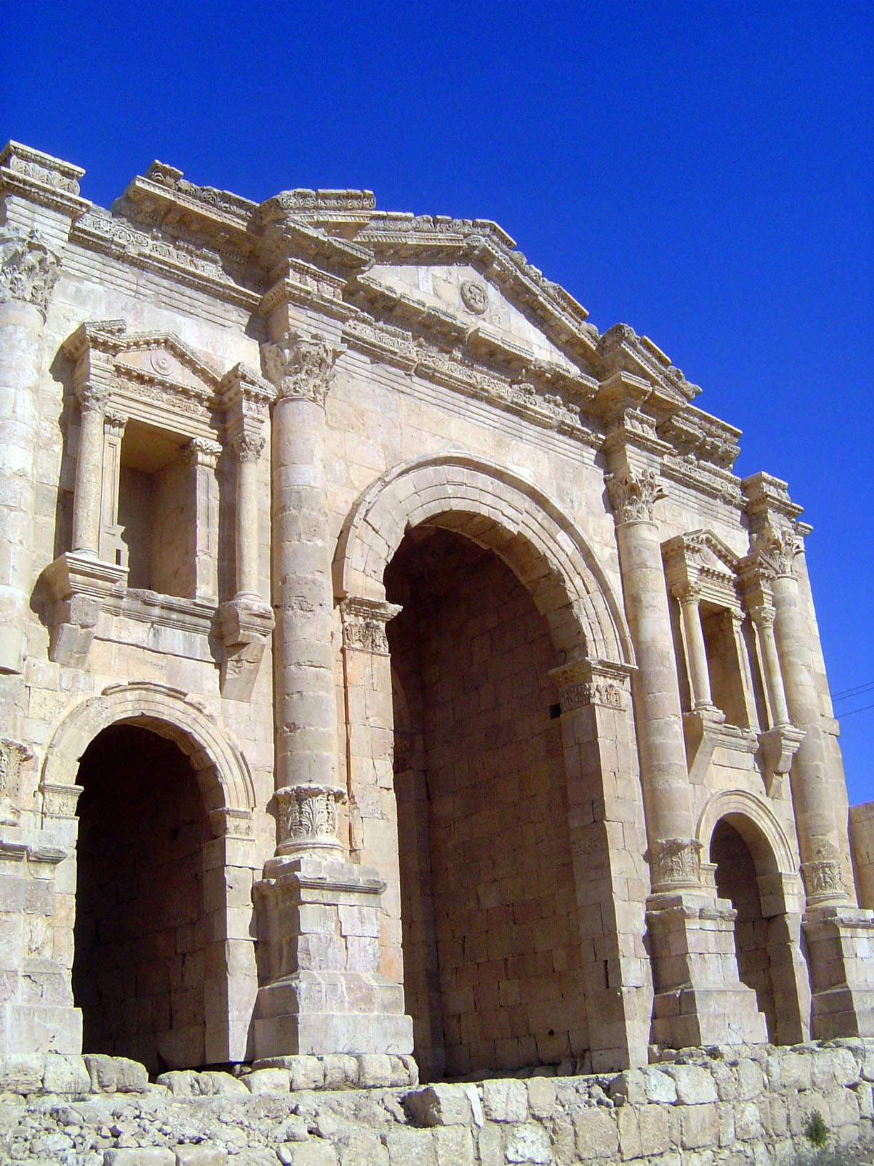 Hadrian's Arch, built at the time of the emperor's visit in 129-130 A.D but, like many buildings in Jerash, more or less reassembled over the last century. When Selah Merrill, the American consul in Jerusalem, visited in 1880, the columns here had no capitals, and the highest point was the keystone.