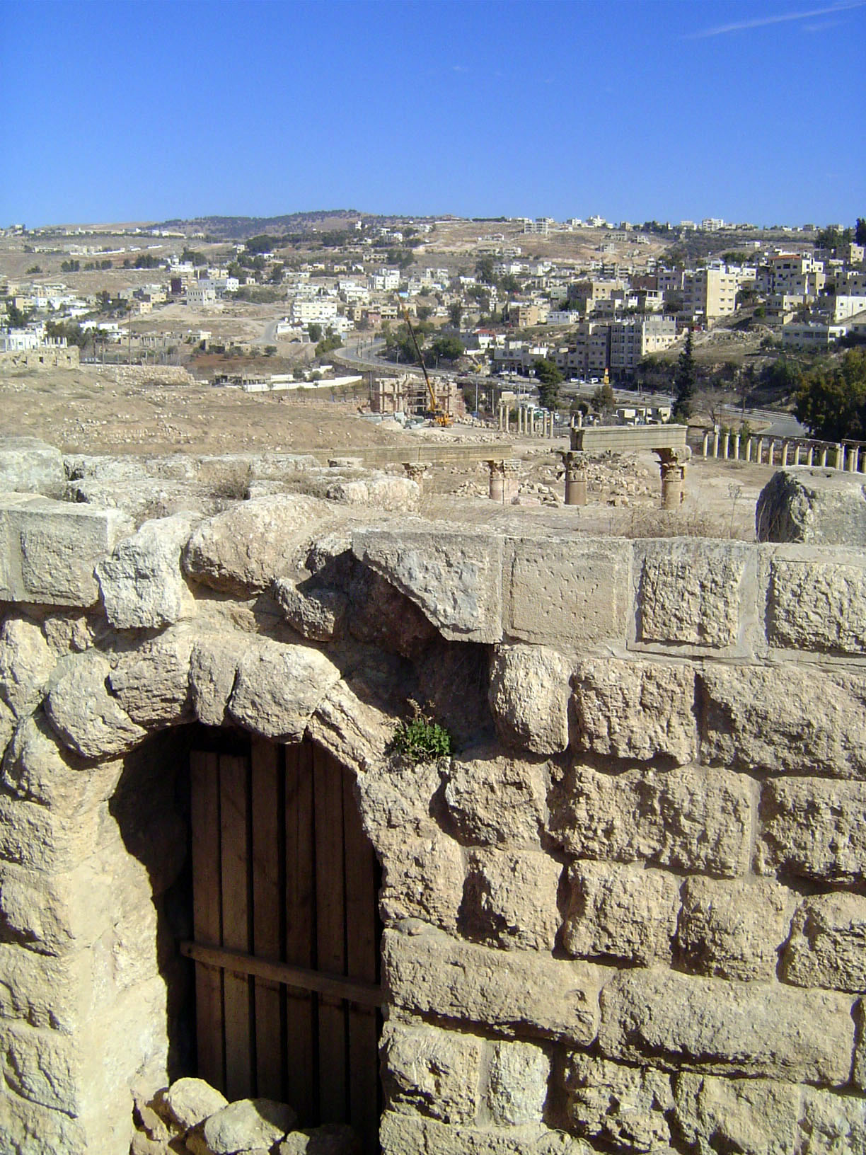 This is the South Theater, which adjoins the Temple of Zeus. It was built in two phases, plainly distinguished by a lower section carved from the hill and—separated from it by the diazoma—a part built up and supported on arches. The modern town of Jerash is in the background.