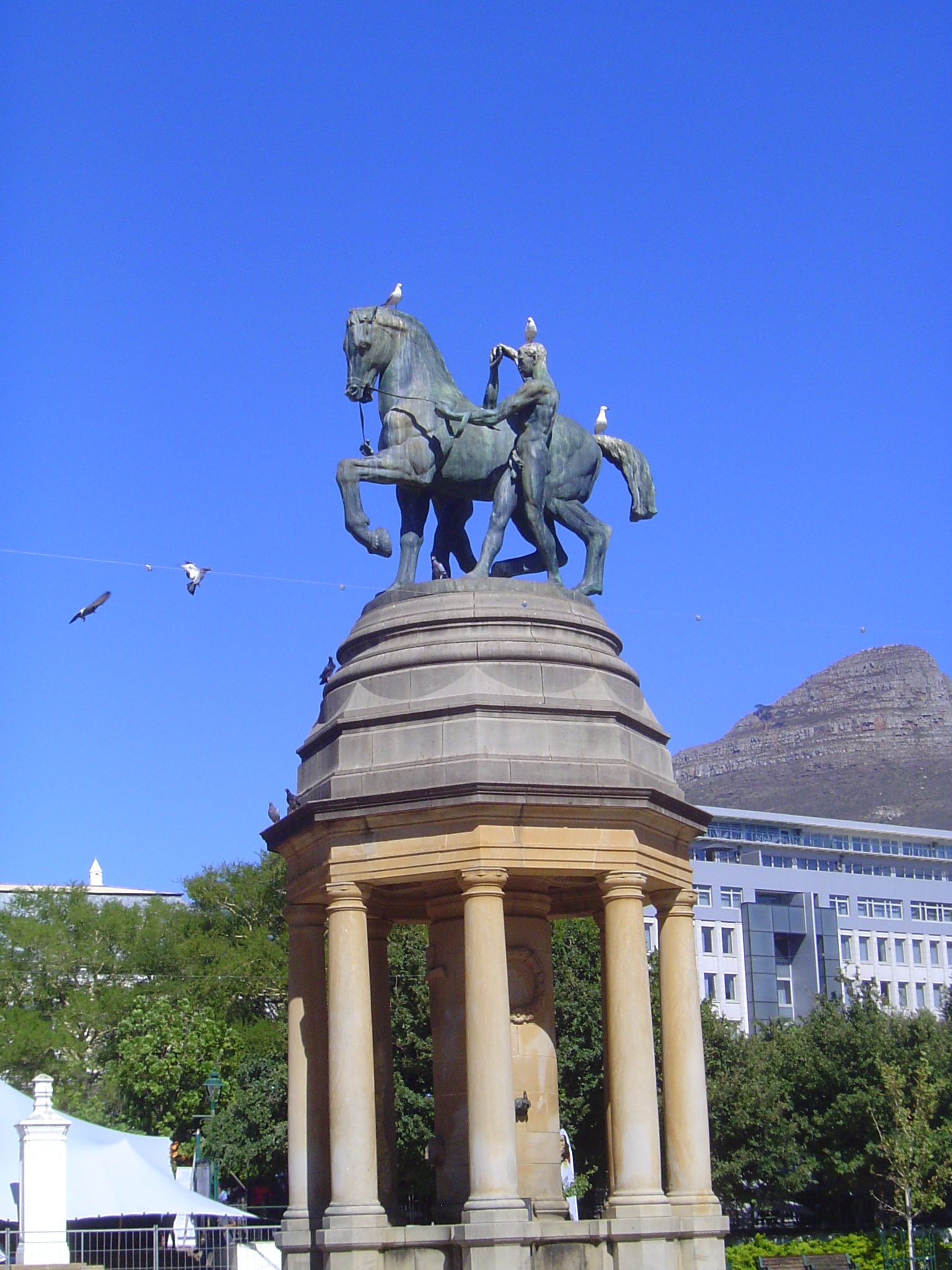 The Victorians loved their statues, but a later generation equally loves to mock them, especially when the subject is a committed imperialist—and filthy rich to boot. The statue, hiding under fresh and mocking attire, was erected in 1908; the sculptor was Henry Pegrem. The base, its rustic surface a reminder of the source of Rhodes' wealth, was by Herbert Baker.