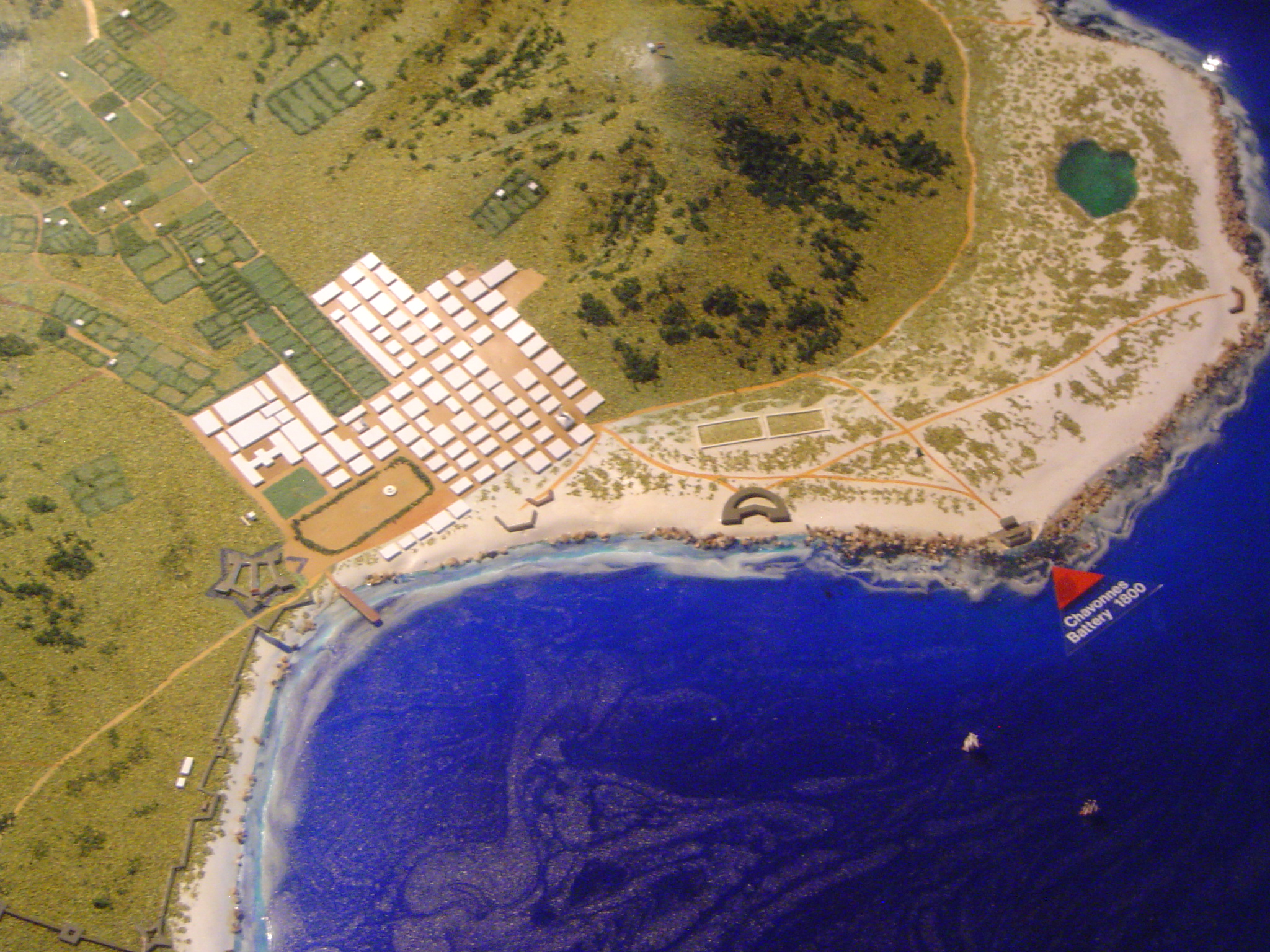 A handy museum model of Cape Town in 1800 highlights in red (1) a bit of coastal fortification, (2) the prominent Amsterdam Battery (shaped like an amphitheater), (3) the tiddly-tidy street grid, and (4) the pentagonal Castle of Good Hope, which when completed in 1679 was on the beach but which reclamation has now left almost a mile from the salt chuck. The museum in question is the Chavonnes Battery Museum, at the red pointer.