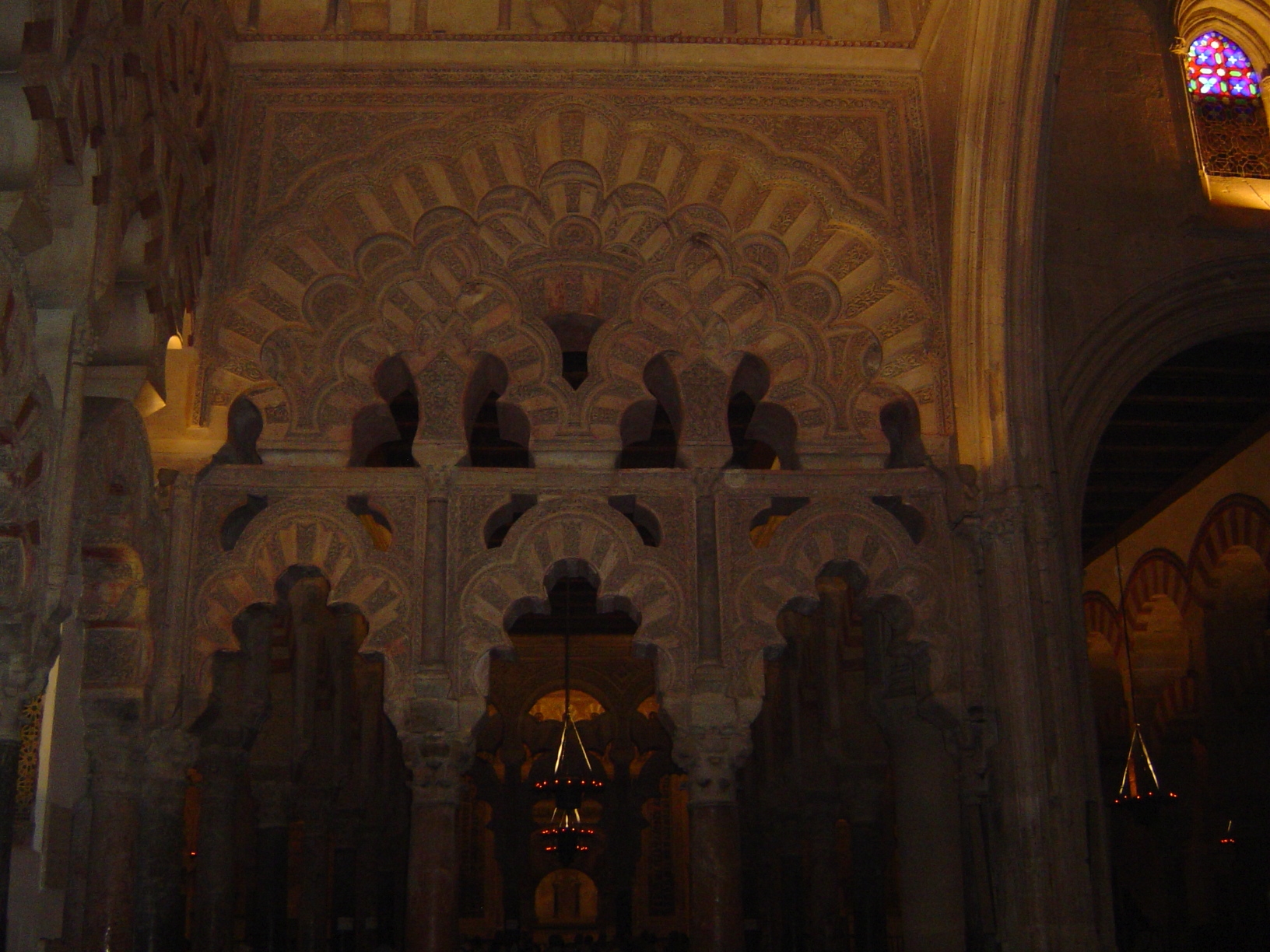 Near the mihrab, or prayer niche, the stonework becomes much more elaborate to define or indicate the maqsura, the enclosure reserved for the sovereign. Islam makes much of the egalitarianism uniting the umma or community of believers, but the opulence of this part of the mosque belies that ideal. The view here looks toward the brightly lit cathedral; the mihrab is behind the camera.