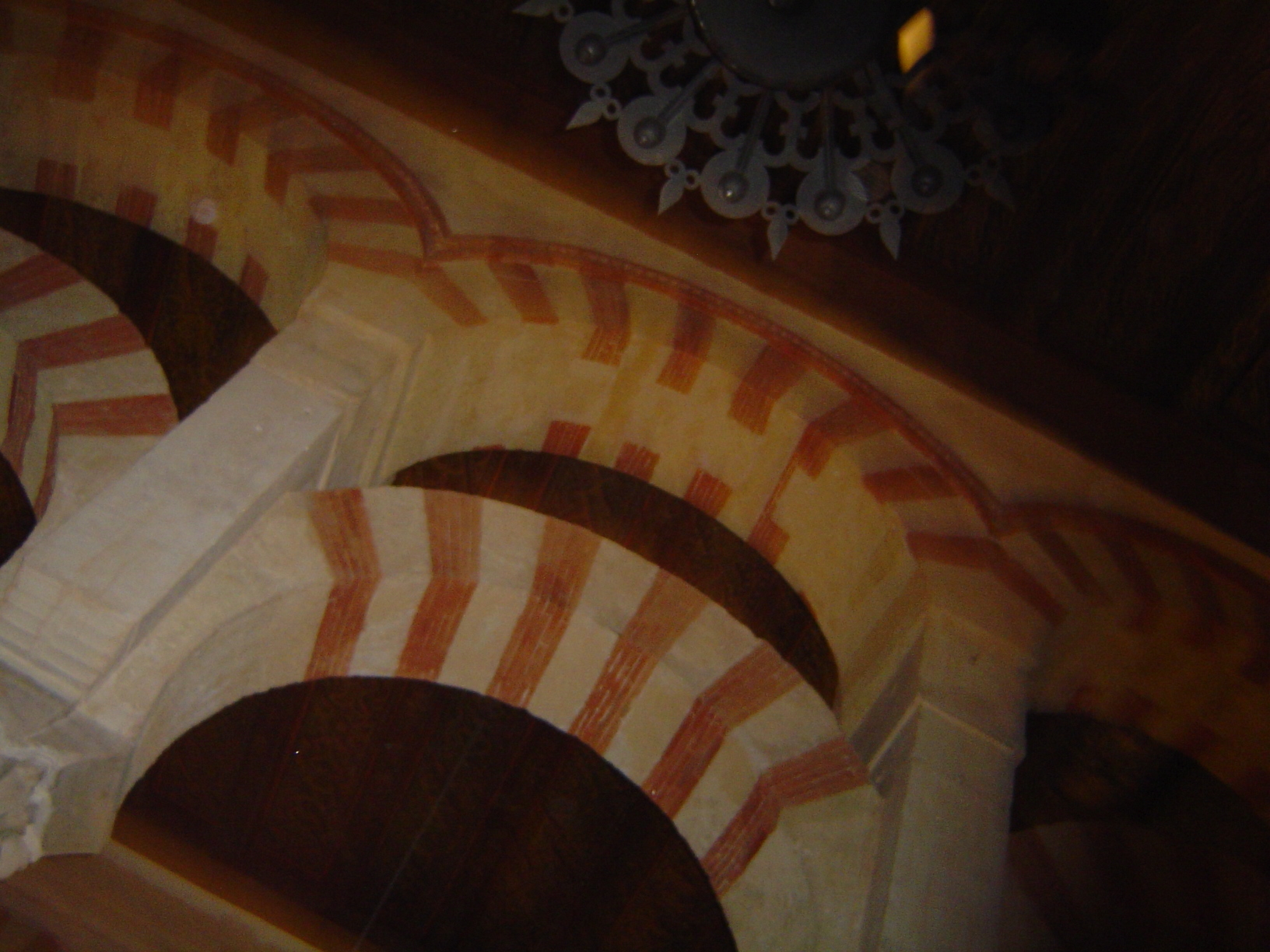 The columns support double-decked arches—the upper circular, the lower slightly horseshoe-shaped. It's a design adapted from Roman aqueducts such as the one at Merida, which also alternates brick and stone voussoirs in a pattern called *ablaq *in Arabic. The horseshoe arch, so associated with the Moors, was also an adopted form, in its case taken from the Visigoths, who had used it in churches such as San Juan de Banos, built in Palencia about 660.
